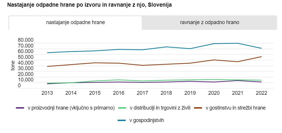 Povprečen Slovenec po podatkih Statističnega urada v enem letu zavrže okoli 72 kilogramov hrane. Največ odpadne hrane nastaja v gospodinjstvih, in sicer 47 %. Sledijo so gostinstvo in strežba hrane s 37 %, trgovina z živili z 9 % in proizvodnja hrane s 7 %.