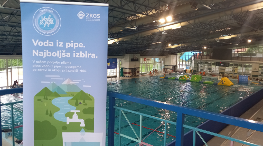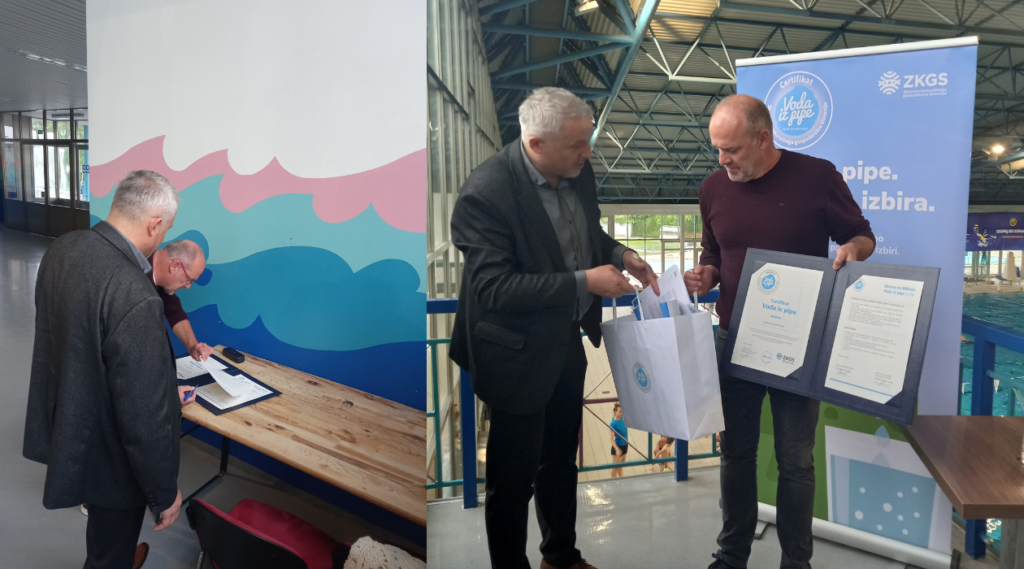 V prijetnem vzdušju na posebni lokaciji Pokritega olimpijskega bazena v Kranju, je Zbornica komunalnega gospodarstva Slovenije podelila certifikat Voda iz pipe. Namestnik direktorja ZKGS mag. Iztok Rozman (na fotografijah spodaj levo) in direktor Zavoda za šport Kranj Tadej Peranovič sta podpisala zaveze certifikata, ZKGS pa je predala tudi promocijski material in slavnostno podelila dokument.