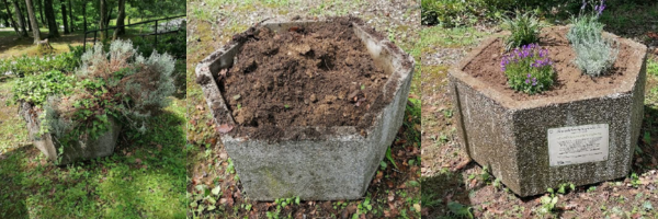 Namesto groba so zasadili cvetlično korito. Rastline, ki so jih pri sajenju uporabili, so: sivka (Lavandula angustifolia ‘Hidcote’), laški smilj ( Helicrhrysum Italicum), zvončnica (Campanula Porteschlagiana) in šaš (Carex morrowii ‘Variegata’).
