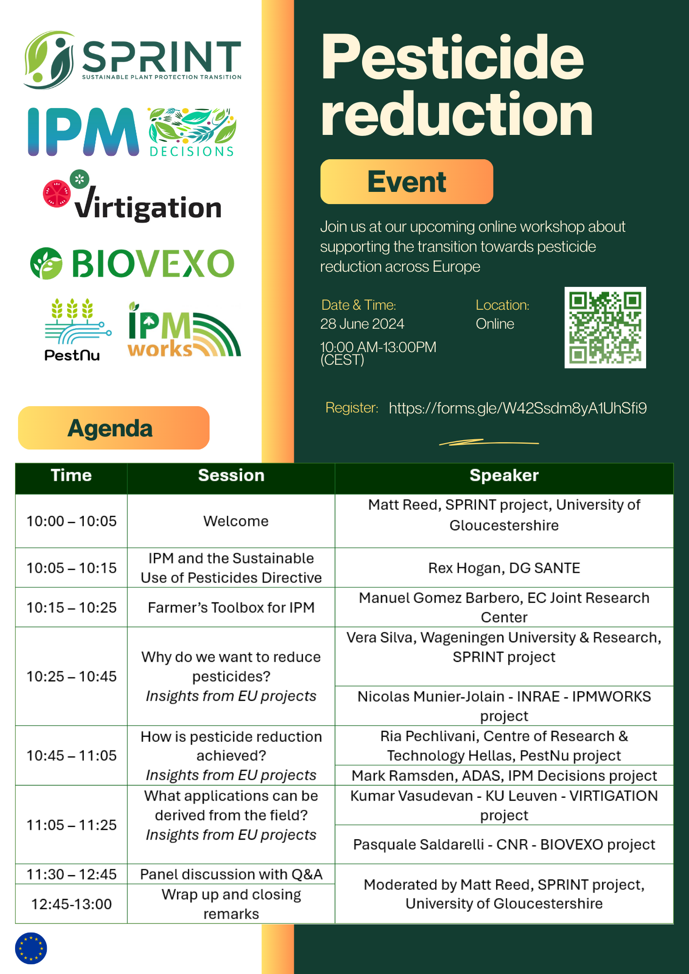 Spletni dogodek, ki bo potekal v petek, 28. junija, od 10. do 13. ure po srednjeevropskem času, bo poudaril vlogo skupnih projektov Green Deal pri prizadevanju za zmanjšanje uporabe in tveganja kemičnih pesticidov ter predstavil nedavne raziskave in dosežen učinek po vsej Evropi. Simpozij bo združil praktike, raziskovalce in oblikovalce politik v iskanju skupne točke in razmisleka o političnih priporočilih za prihodnost trajnostne rabe pesticidov v Evropi.
